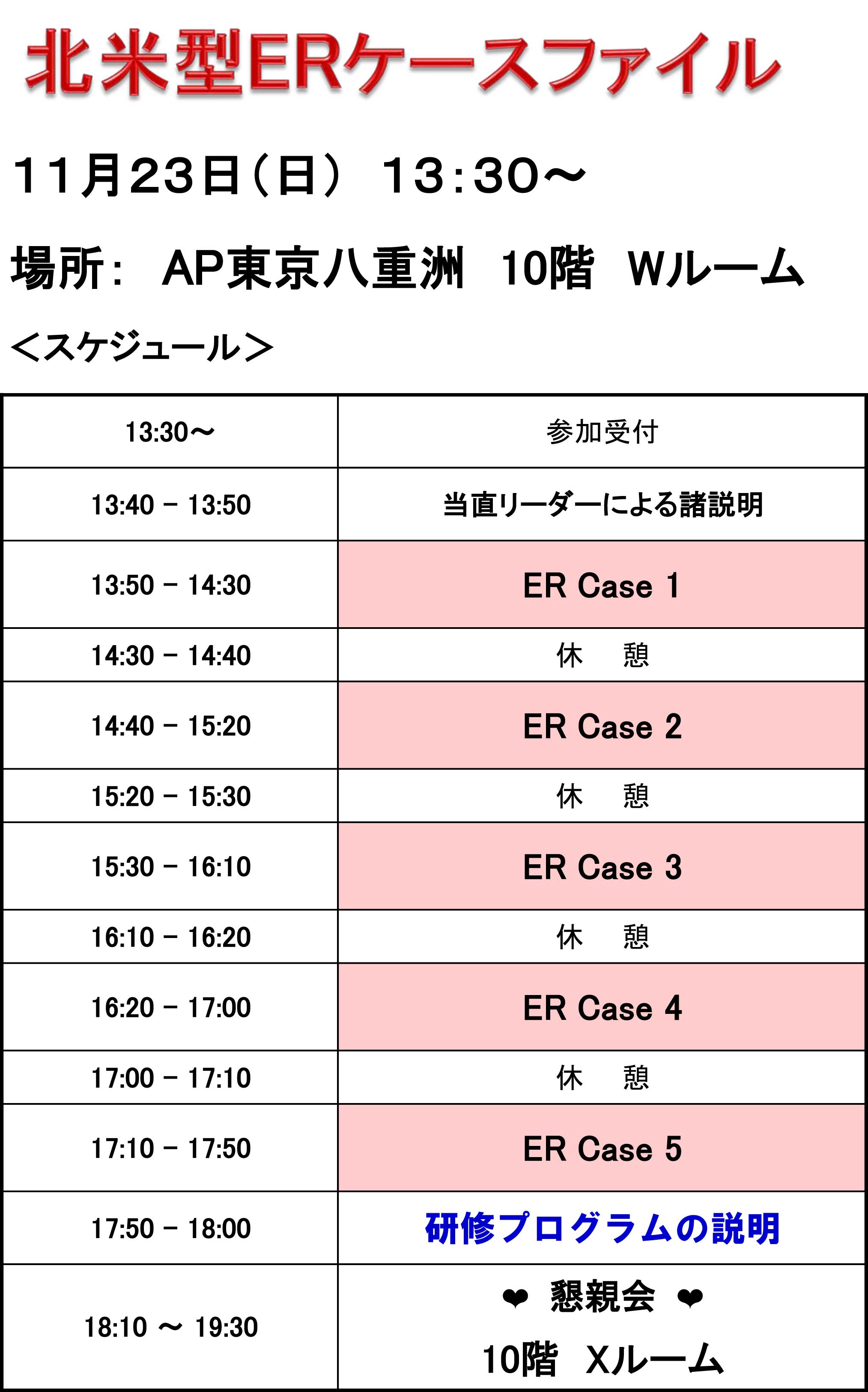 この会は、北米型ERで出会った症例をみなさんと一緒にシェアする勉強会です。